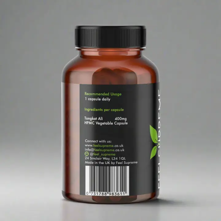 Feel Supreme Tongkat Ali (Eurycoma Longifolia) is a 100:1 extract standardised to 2% Eurycomanone, supporting testosterone, vitality, mood, and stress resilience.